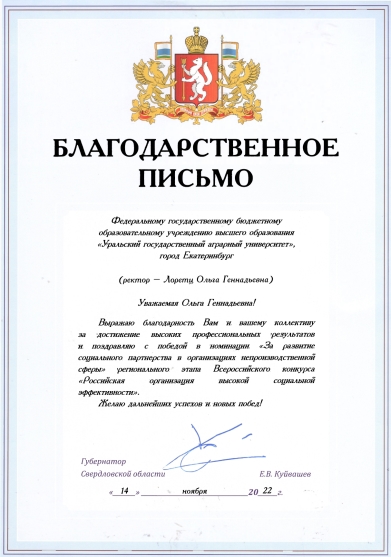По этому поводу губернатор Свердловской области Евгений Владимирович Куйвашев поблагодарил ректора УрГАУ Ольгу Геннадьевну Лоретц и коллектив вуза за достижение высоких профессиональных результатов и пожелал дальнейших успехов и новых побед.