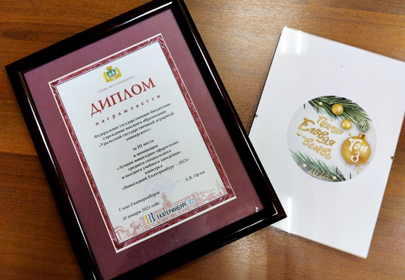 По итогам конкурса Уральский государственный аграрный университет завоевал Диплом победителя за 3 место в номинации «Лучшее новогоднее оформление среднего специального и высшего учебного заведения». Награду Глава города вручил проректору по организационным и общим вопросам УрГАУ Н.А. Юрченко.