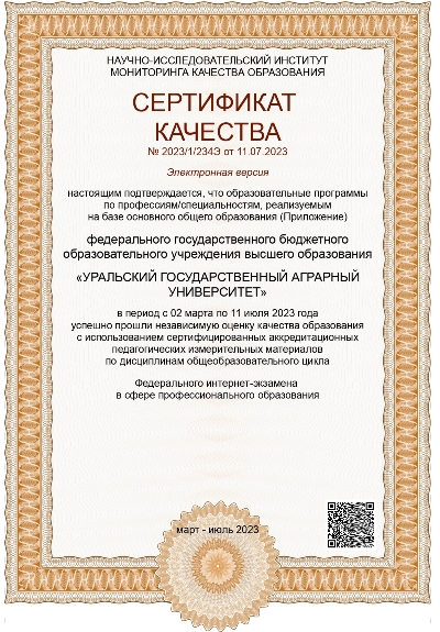 В период со 2 марта по 11 июля 2023 года Уральский государственный аграрный университет успешно прошел независимую оценку качества образования по сертифицированным аккредитационным педагогическим измерительным материалам (АПИМ) в рамках проекта «Федеральный интернет-экзамен в сфере профессионального образования».